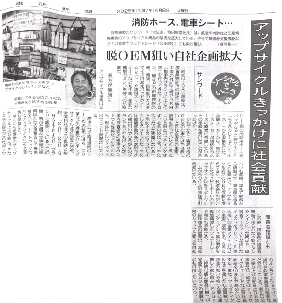 2025年4月8日(火)発刊の繊研新聞にて、当社の取り組みについて掲載していただきました。