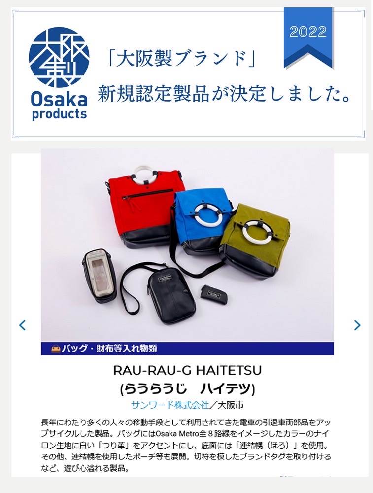 電車の引退車両の部品をアップサイクルしバッグや小物を展開する当社ブランド「RAU-RAU-G HAITETSU(らうらうじ ハイテツ)」が令和4年度大阪製ブランド製品に認定されました。