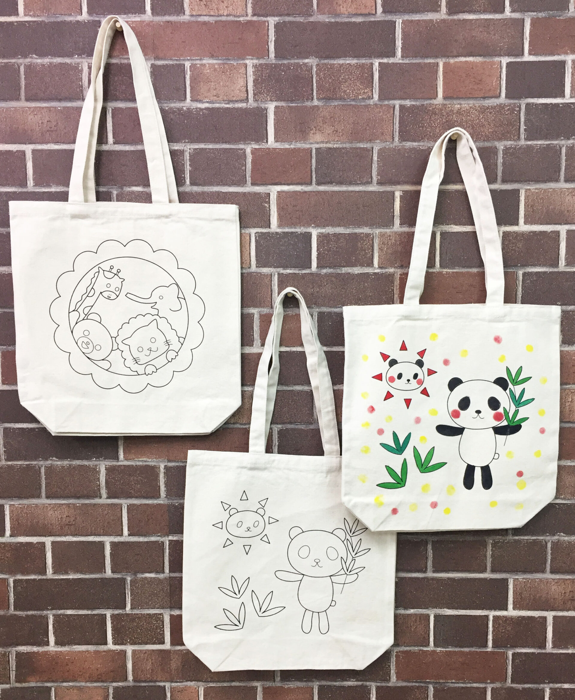 トートバッグにプリントされた動物のイラストを布描きクレヨンを使って自由にぬりえをしていただきます。