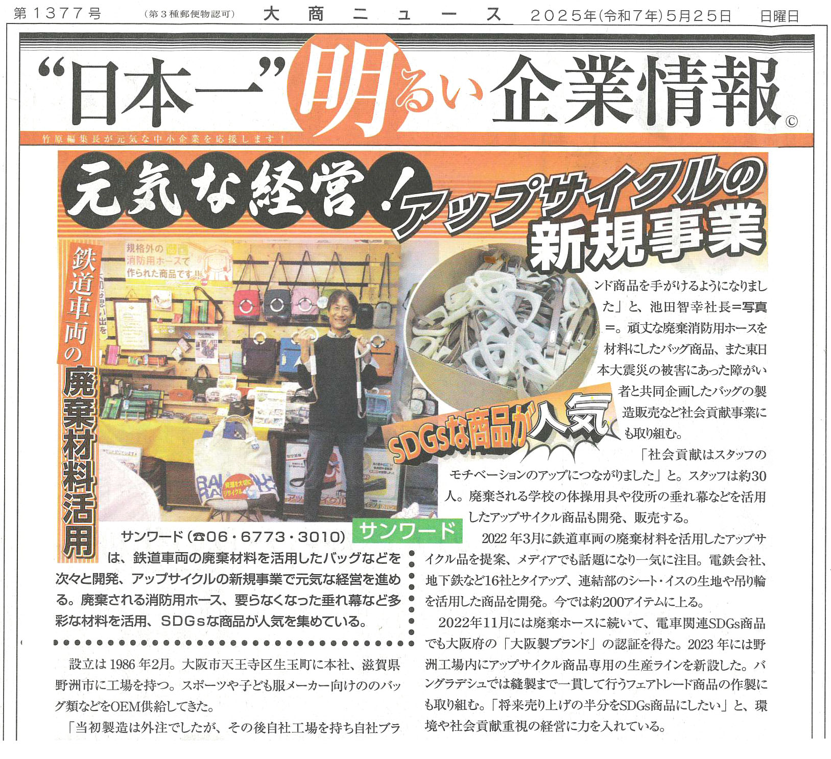 2025.05.25 メディア 大商ニュースに掲載されました 2025年5月25日(日)発刊の大商ニュースにて、当社アップサイクルの取り組みについて掲載していただきました。 紹介されている商品は当社ネットショップにてご購入いただいけます。 一覧へ戻る