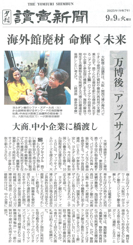 2025年9月9日(火)発刊の読売新聞にて、当社アップサイクルの取り組みについて掲載していただきました。