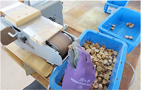 東日本大震災で被災した福島県下の福祉事業所の障がいのある方の仕事づくりのために、木製ボタンを施設の皆さんのと共同開発しました。地域の福祉施設での仕事の創出や、「牡丹の街」で作られるボタンを通し働きがいや復興支援に寄与しています。